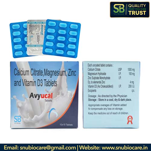 Avyucal-tabs. | Calcium + Citrate 1000mg +magnesium Zinc 100mg + Elemental Zinc 4mg Vitamin D3 200iu |