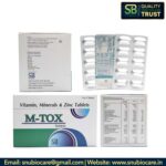 M-tox Tabs. | Carbohydrate 0.1gm+Vitamin A 5000IU + Thiamine+10mg+ Ribofalvin 10mg+ Pyridoxine 3mg+ Niacinamide+ 50mg+ Cynocobalamine+10mcg Selenium 70 mcg + Folic acid300mcg +zinc 40mg |